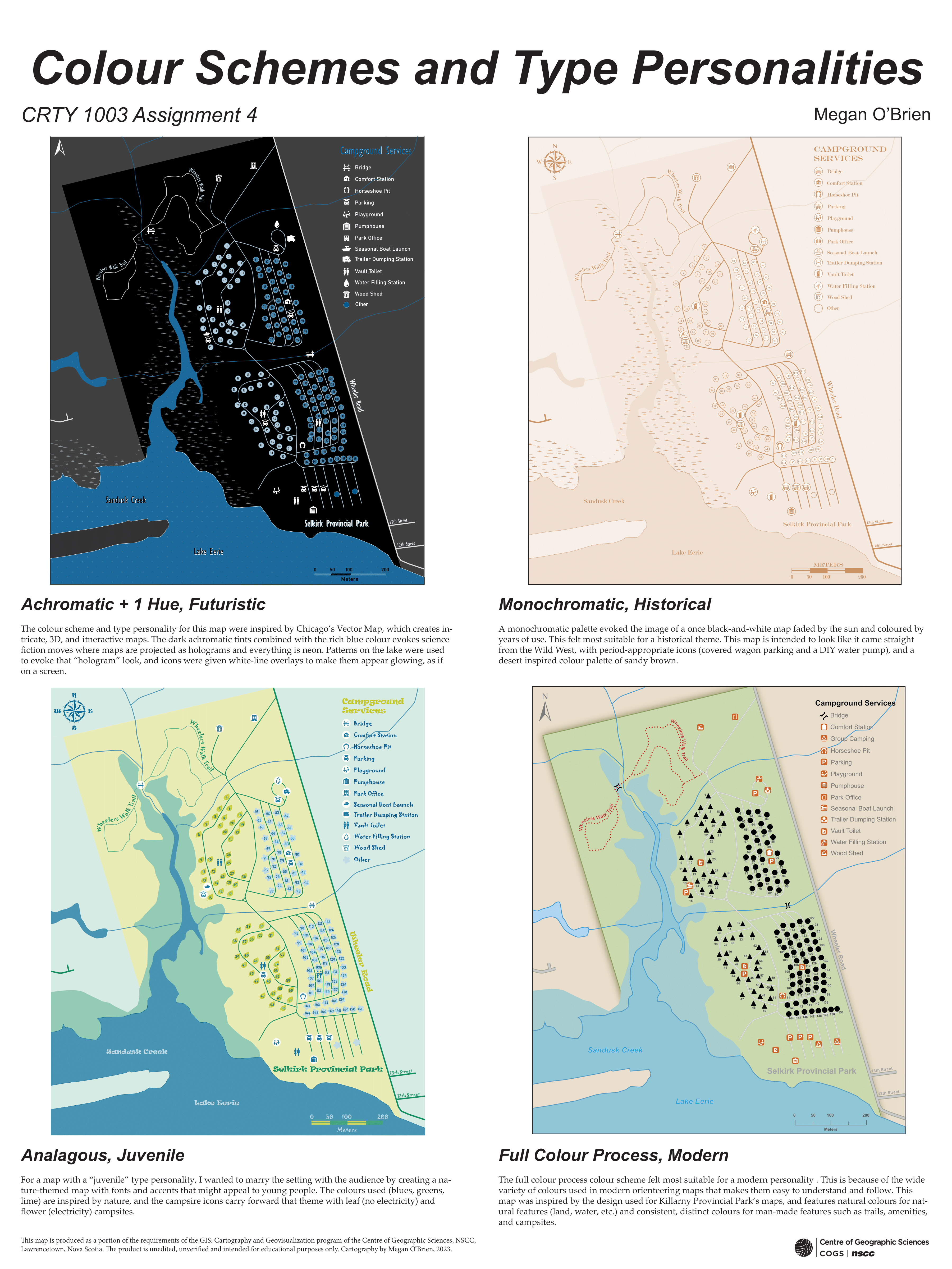 Using a map of Selkirk Provincial Park, Ontario, cartographic type styles and colour schemes are explored to create four highly distinct maps, each with their own distinct look and feel. These maps were completed in Adobe Illustrator.