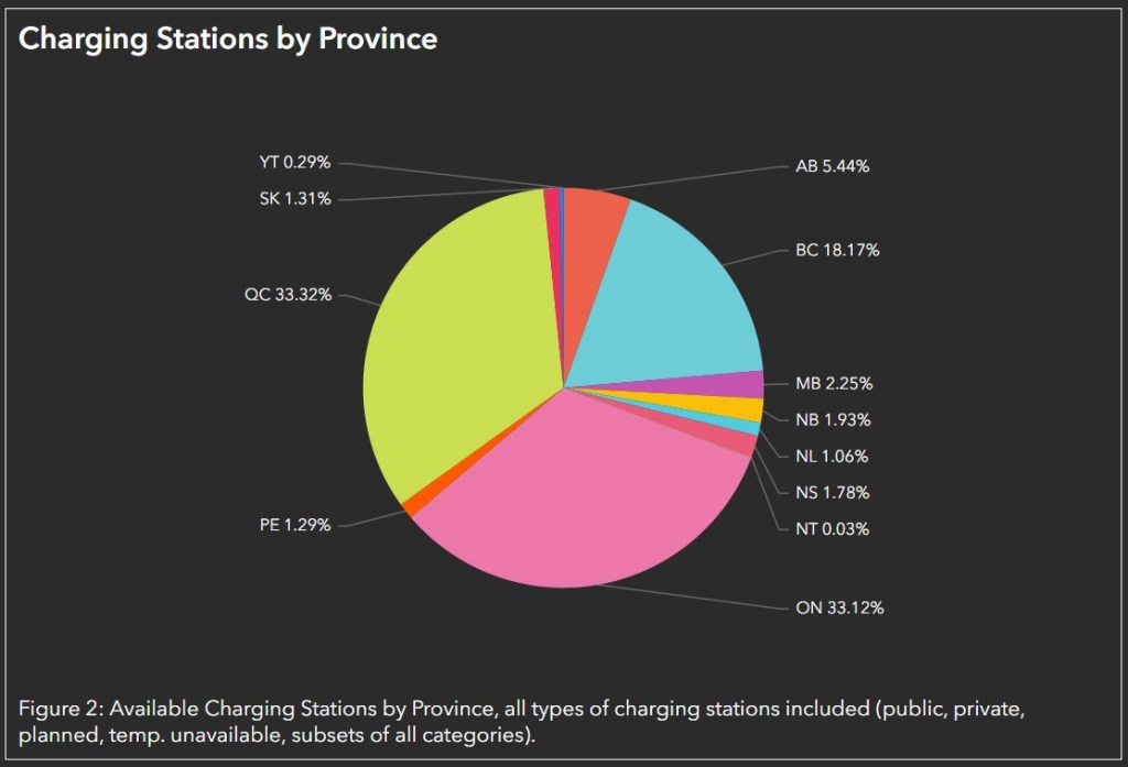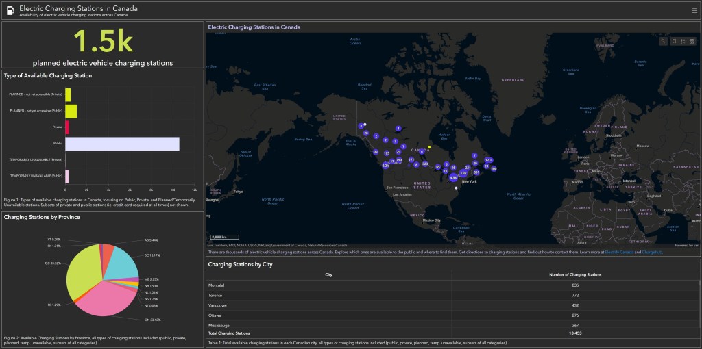 Using ArcGIS Online Dashboards, I synthesized information from National Resources Canada to visualize where drivers can locate electric vehicle charging stations across the country.