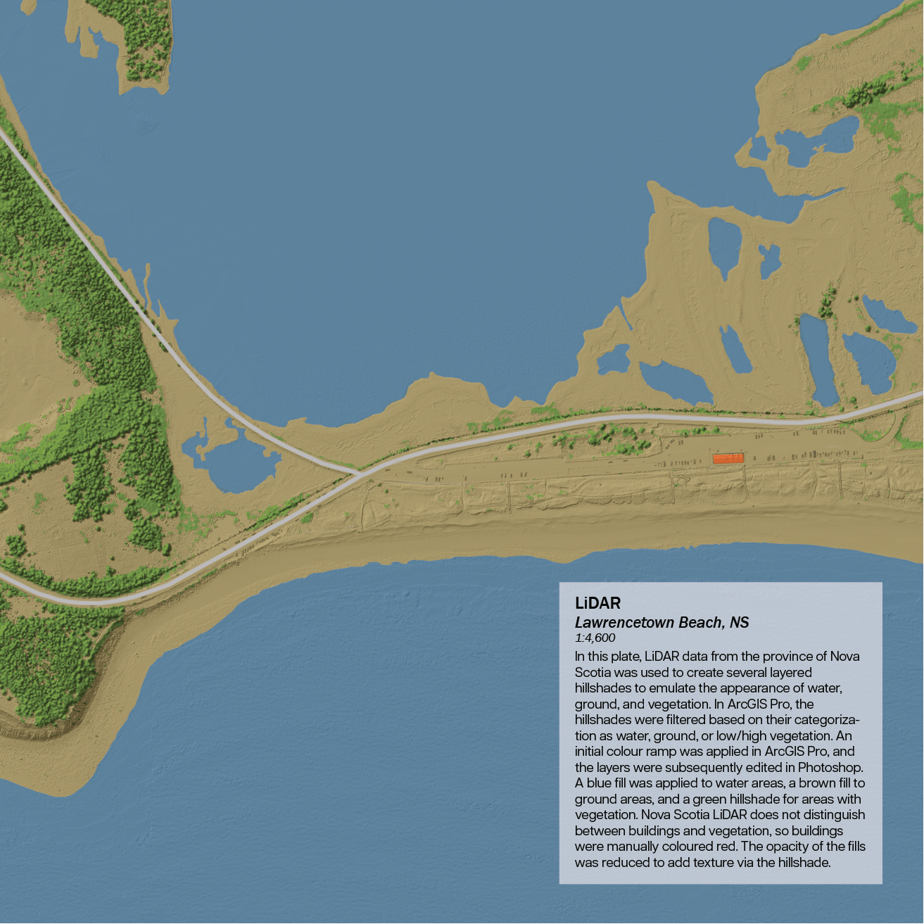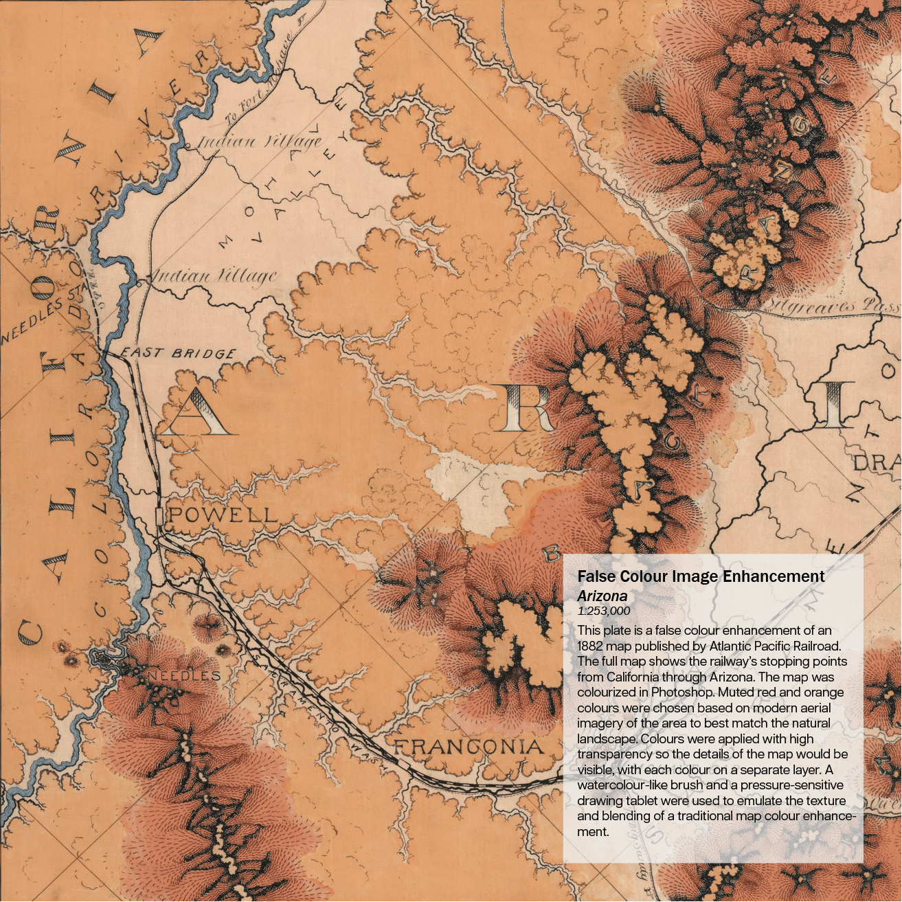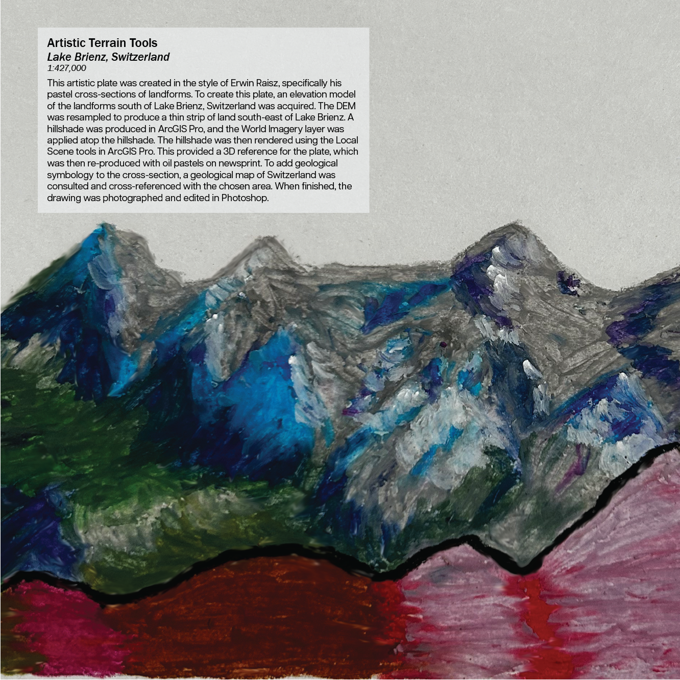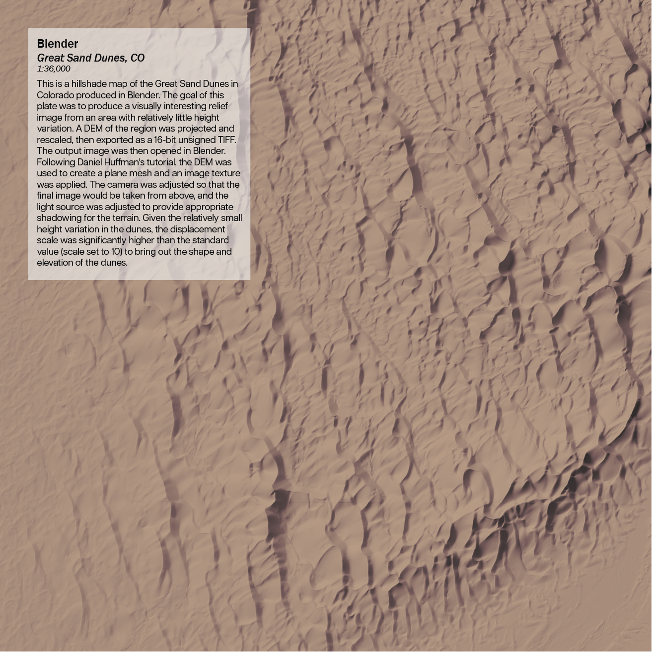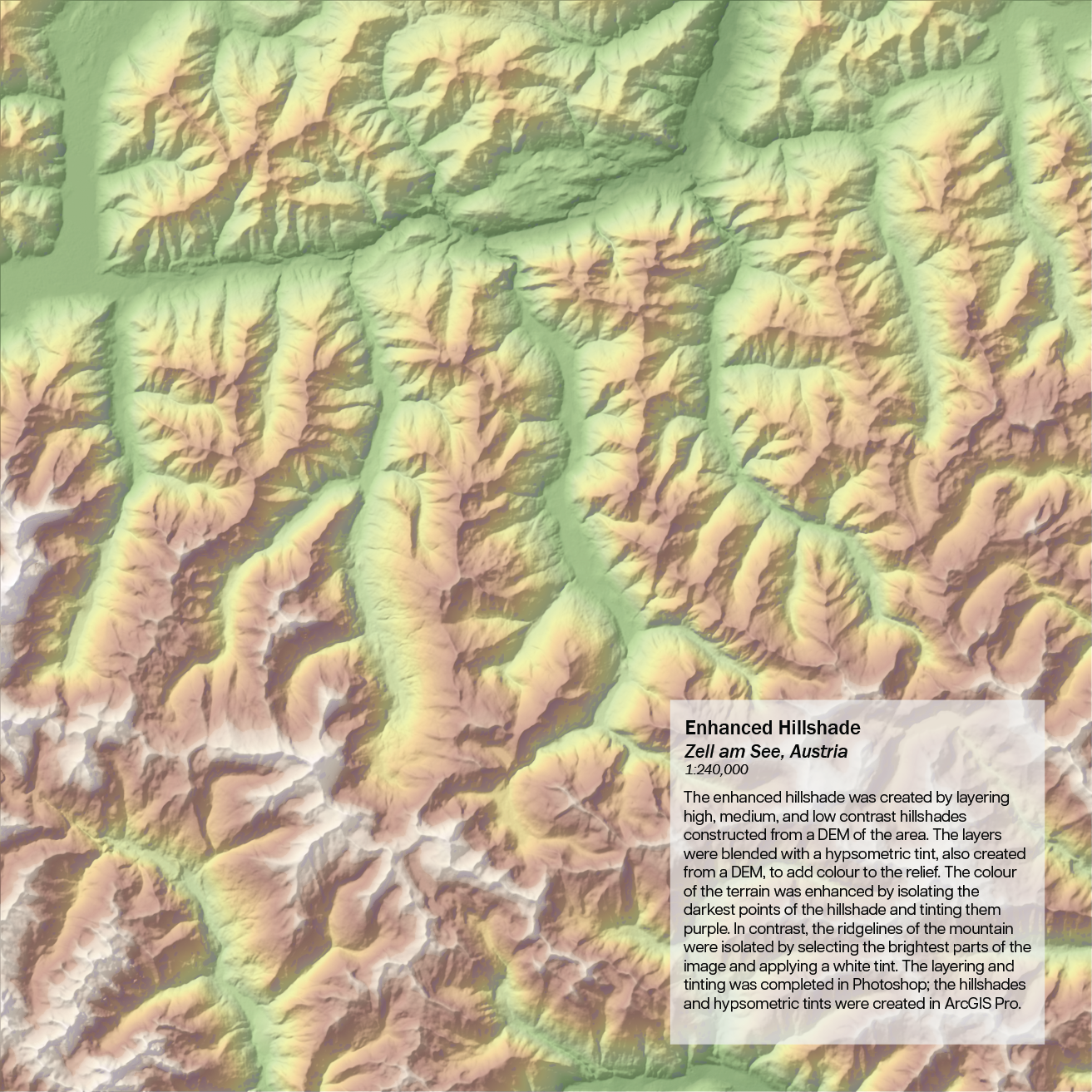 The terrain atlas represents a culmination of skills in terms of working with terrain data, producing varying representations of terrain around the world. Plates were produced in ArcGIS Pro, Photoshop, Illustrator, Blender, and by hand, using Landsat imagery, LiDAR data, and aerial photography.