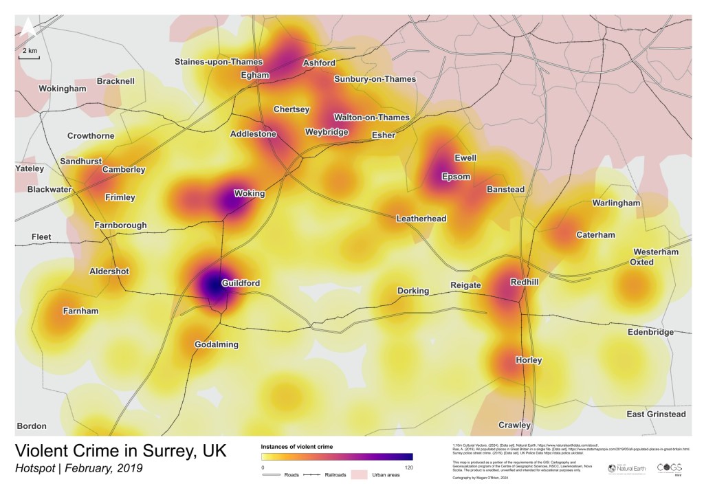 Focusing on analyzing violent crime data in Surrey, UK, this project utilized a variety of geovisualization techniques in QGIS to identify regions with high incidences of violent crime. An accompanying technical report details background and methods. The technical report is available for download.