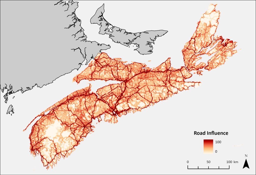 In a practicum term for the Nova Scotia Department of Natural Resources, I worked on developing a new Road Index tool to assess the ecological impact of the province’s transportation network on the surrounding landscape. The index calculations consider the type of transportation (e.g., highway, powerline, trail), the density of linear features, and the distance of an area from nearby transportation features.