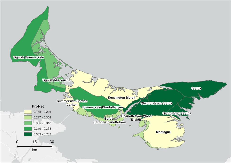 - The Protected Network (ProNet) and Protected Connected (ProtConn) metrics were calculated provincially and regionally for Prince Edward Island to compare the effectiveness of the metrics for assessing landscape connectivity.